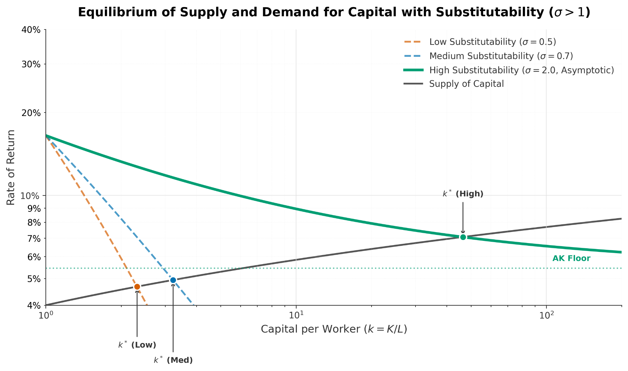 The “robots building robots” story maybe implies η→1: self-replicating capital eliminates installation frictions. Investment translates directly into productive capacity without waste. This lowers the effective cost of capital accumulation, shifting the supply curve down and making unbounded growth more plausible. Notice is it bounded at 1.