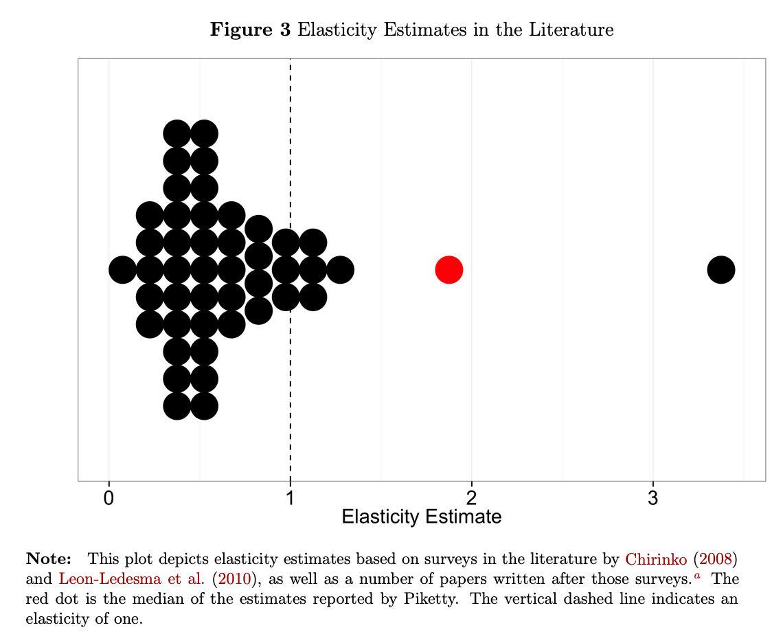 As Philip and Dwarkesh point out, this responsiveness determines how income shares change when the economy accumulates more capital. Most empirical estimates find that firms don’t substitute very easily. The “elasticity of substitution” between capital and labor is well below one, which is below what is needed for the Piketty capital accumulation spiral.2