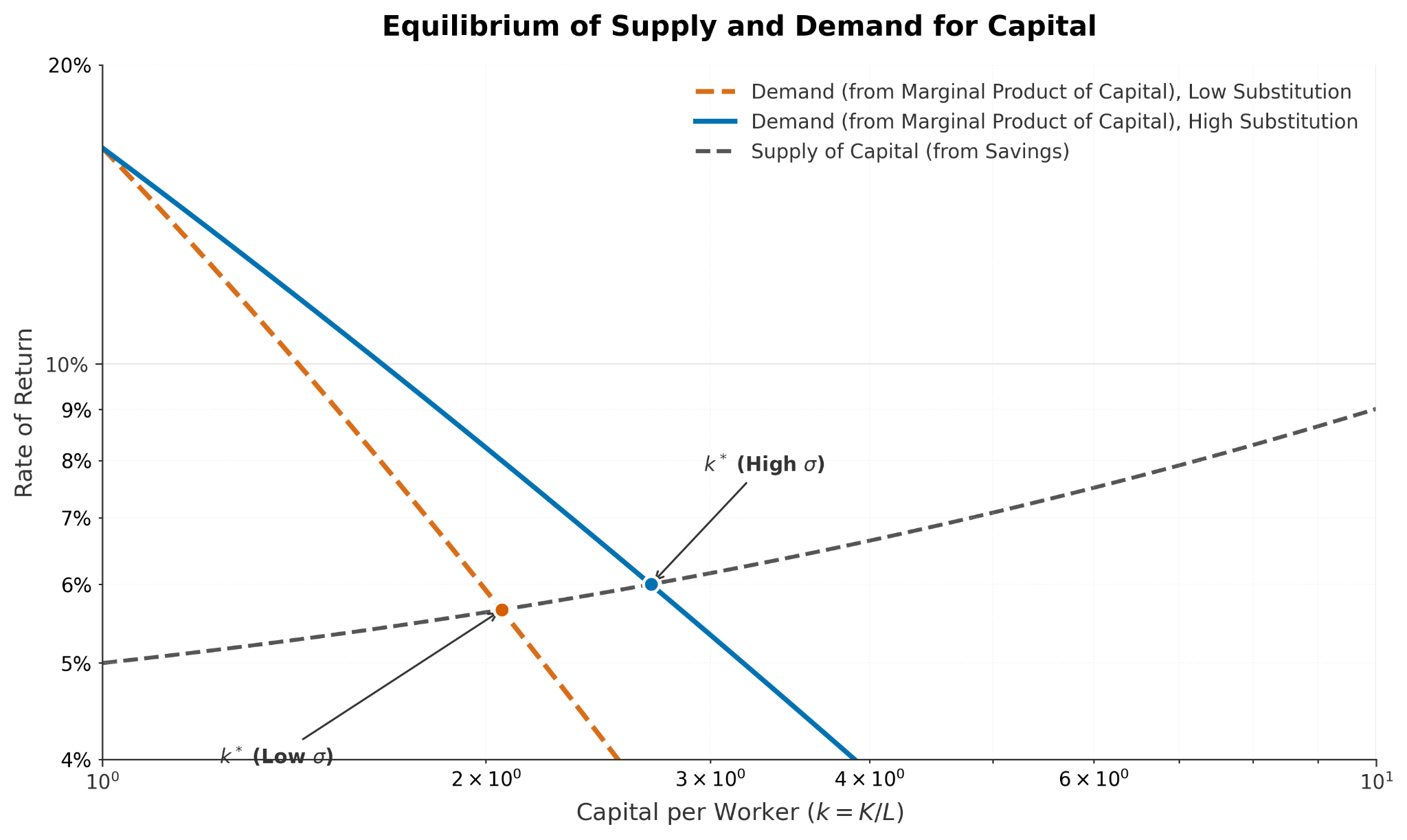 Substitutability in production measures how much the return on capital falls as you add more capital. It’s the slope of the demand curve. High substitutability means a flat demand curve. You can add a lot of capital before returns fall much.