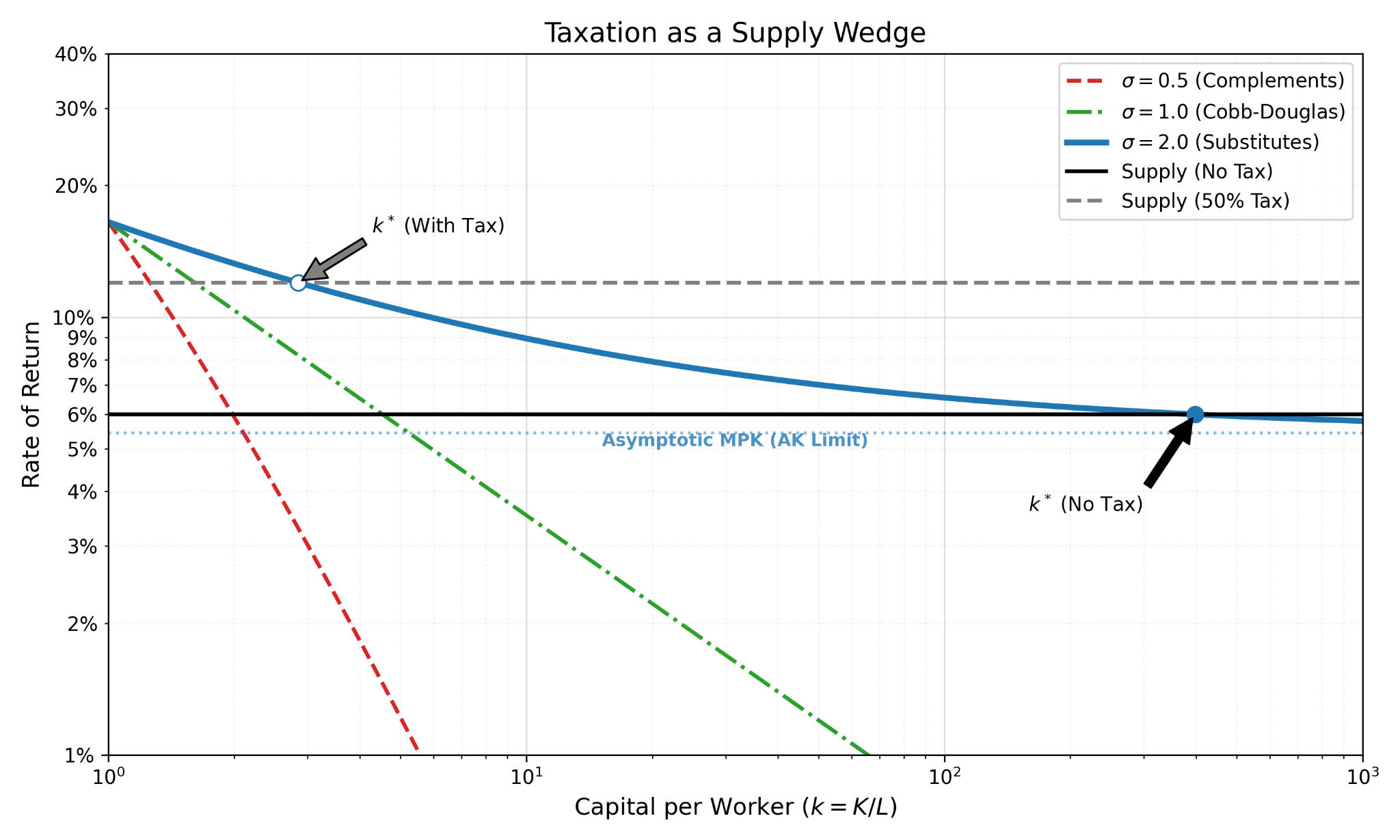 High substitutability means workers are easily replaced by machines. That’s the inequality story. But it also means firms respond aggressively to any increase in capital costs. A flatter demand curve means capital flees faster when taxed, and labor bears a heavier burden through lost wages.