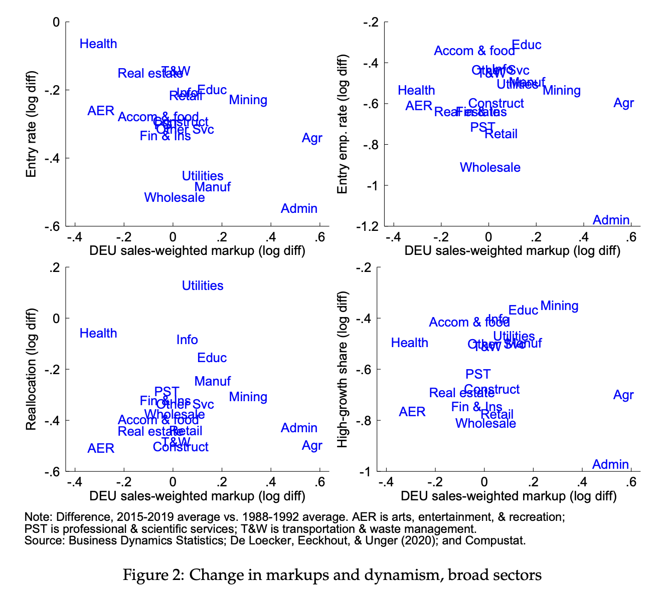 More importantly, their story about superstar firms blocking innovation contradicts the industry-level evidence. As I said, my work with Ryan Decker found no correlation between industries that saw rising markups and those that experienced declining business dynamism. If superstar firms were using their market power to suppress creative destruction, we should see this pattern consistently across industries. We don’t find that.