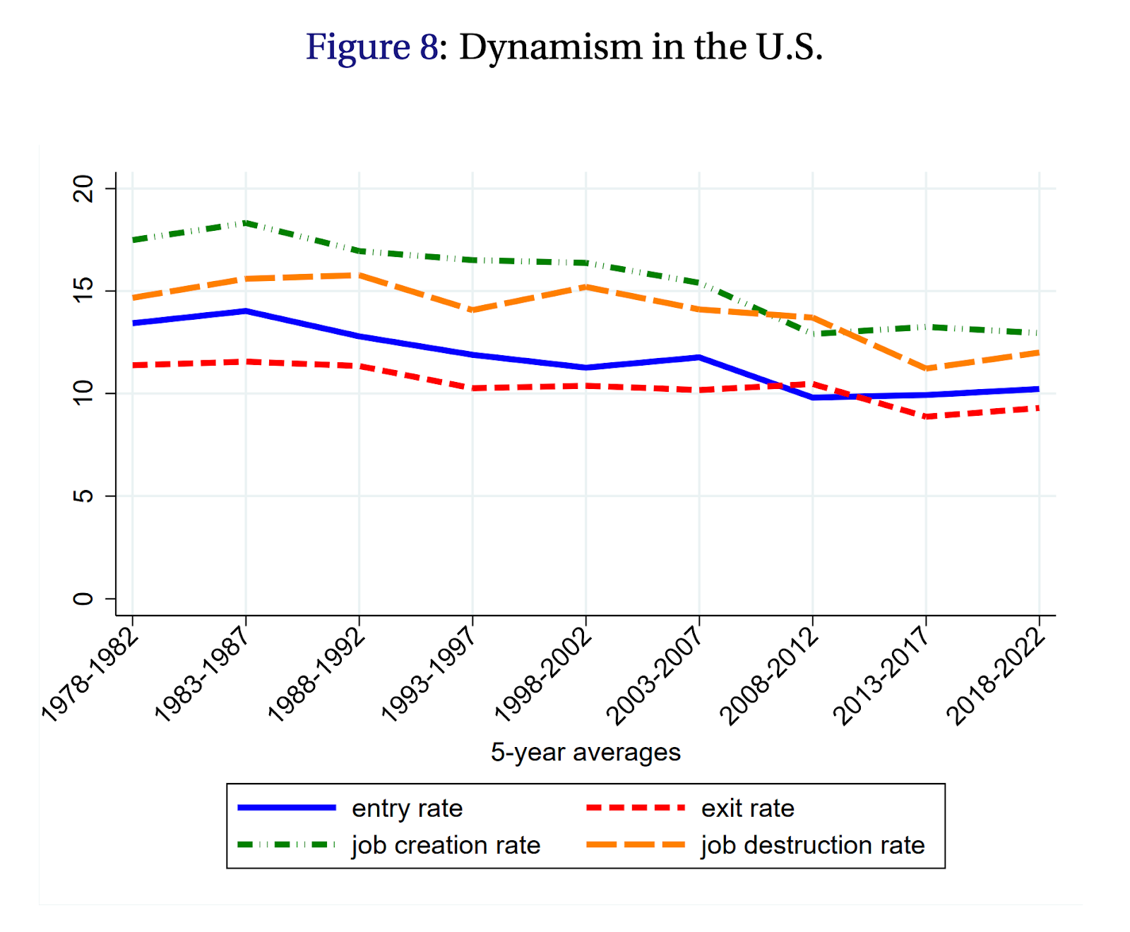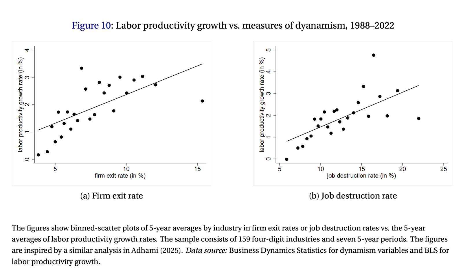 The aggregate entry, exit, and job-reallocation rates tell us whether this process is working economywide. When Baqaee and Farhi find that half of all productivity growth comes from reallocation, they’re measuring an average effect across many industries. Some industries might show little turnover. Others show lots. The average captures whether the creative-destruction process is functioning.