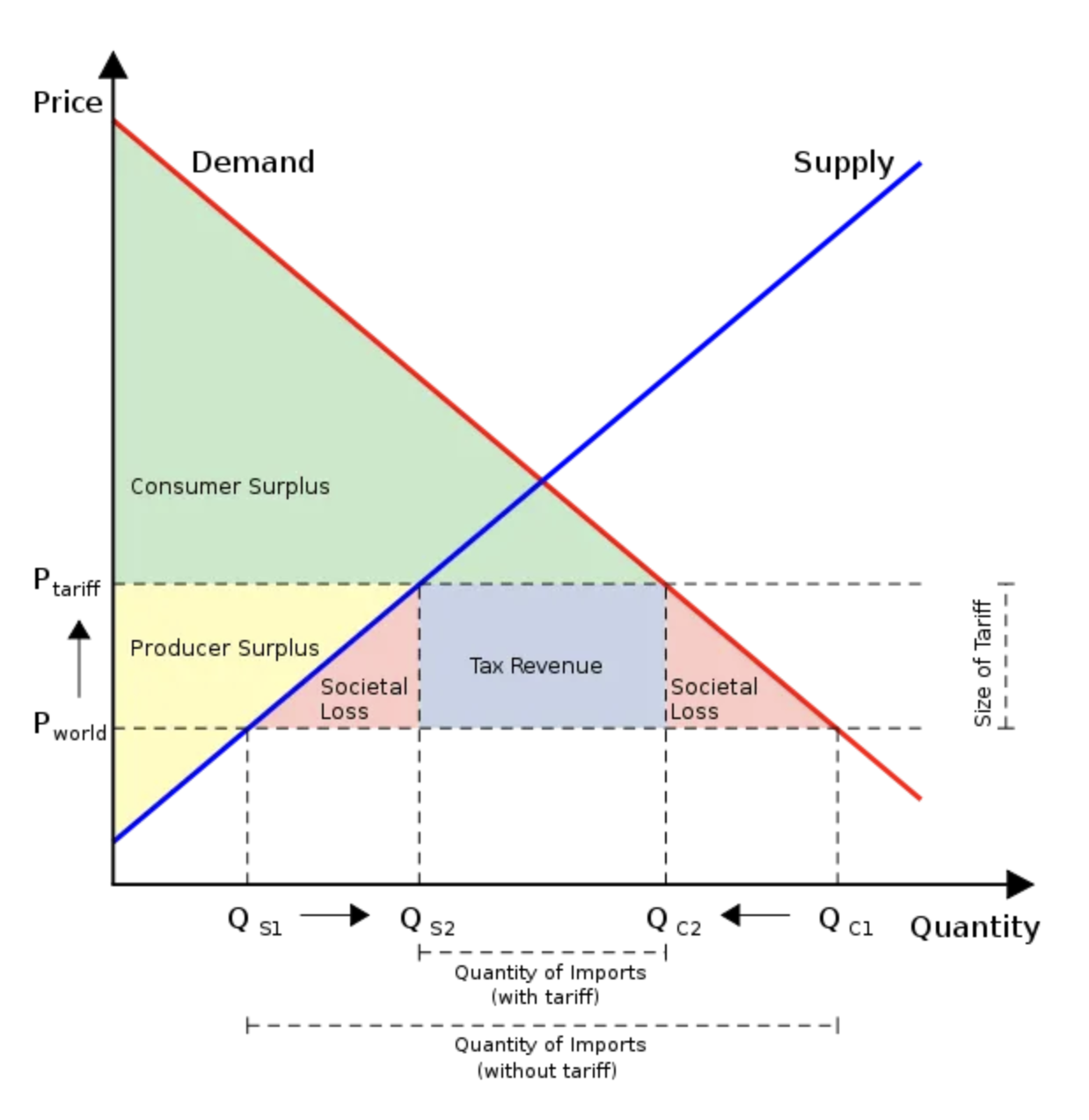 It’s usually not the main takeaway, but there is an upside to tariffs in the basic model; tariffs benefit domestic manufacturers. The standard trade model taught in Econ 101 is shown below. It’s supply and demand, but where the usual sloped curves are only the domestic supply and demand. On to that, we add a world supply curve that is horizontal at the price P_world. With the tariff, the price is bumped up to P_tariff.