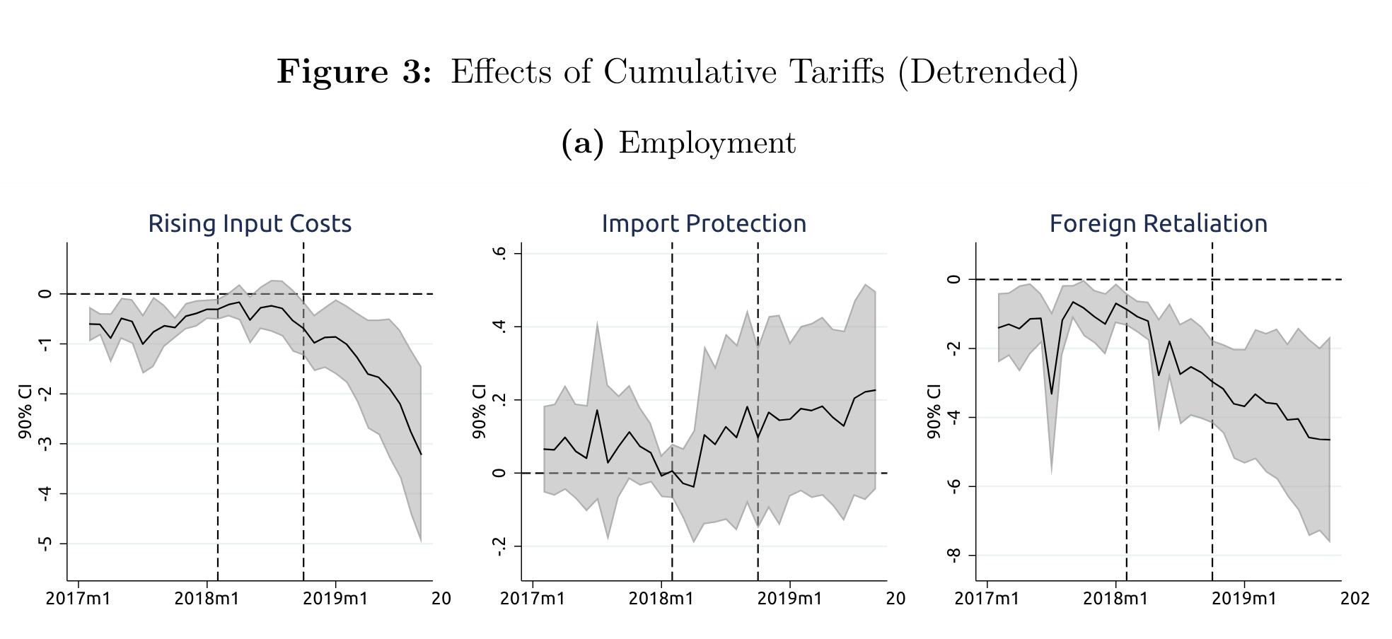 Given these complications, what actually happens when countries impose major tariffs? The same wave of U.S. tariffs on Chinese goods provides a clear example. Instead of helping U.S. manufacturers, Aaron Flaaen and Justin Pierce found that these tariffs led to higher costs for manufacturers using Chinese inputs, job losses in industries reliant on Chinese imports, only small employment gains in protected industries, and higher consumer prices across many sectors. Overall, the negative effects of higher input costs and reduced exports outweighed any benefits from import protection for manufacturers as a group.