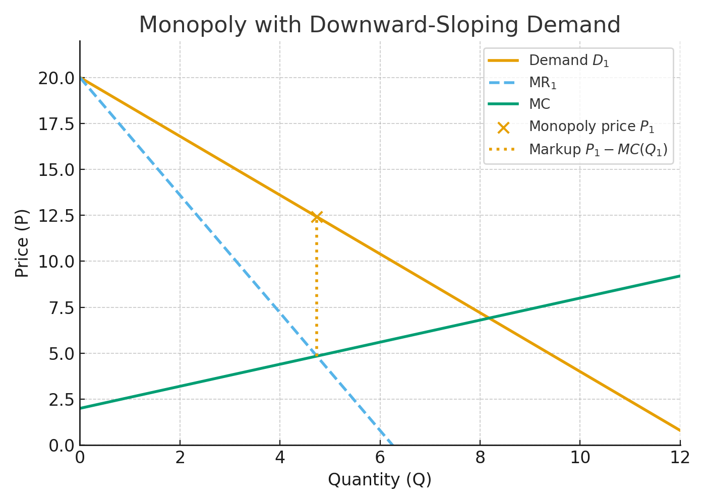 Let’s take one more variation on the monopoly model, a more standard case: a normal downward-sloping demand curve and upward-sloping marginal cost curve. Make everything linear to keep life simple. The monopolist sets the price and has some pricing power. They can raise price above marginal cost without losing all their customers.