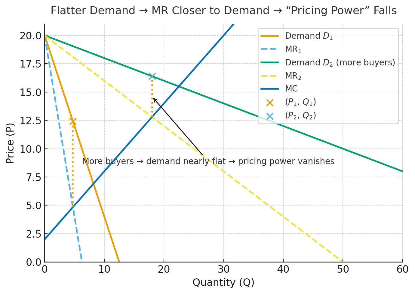 The monopolist still sets the price. That hasn’t changed. But the pricing power (in the sense of raising price above marginal cost) shrinks. More buyers makes the demand curve more elastic. The price may actually rise because demand has shifted out, but the gap between price and marginal cost narrows. The monopolist’s ability to exploit their position erodes even as the market grows. Price-setting power stayed constant. More buyers entered the market, so it may seem like the monopolist has even more power. But actually, stiffer competition between buyers means that pricing power declined. The price-setting situation stayed the same, the number of buyers increased, which the monopolist clearly likes, but pricing “power” declined in an important sense. Markups decline.