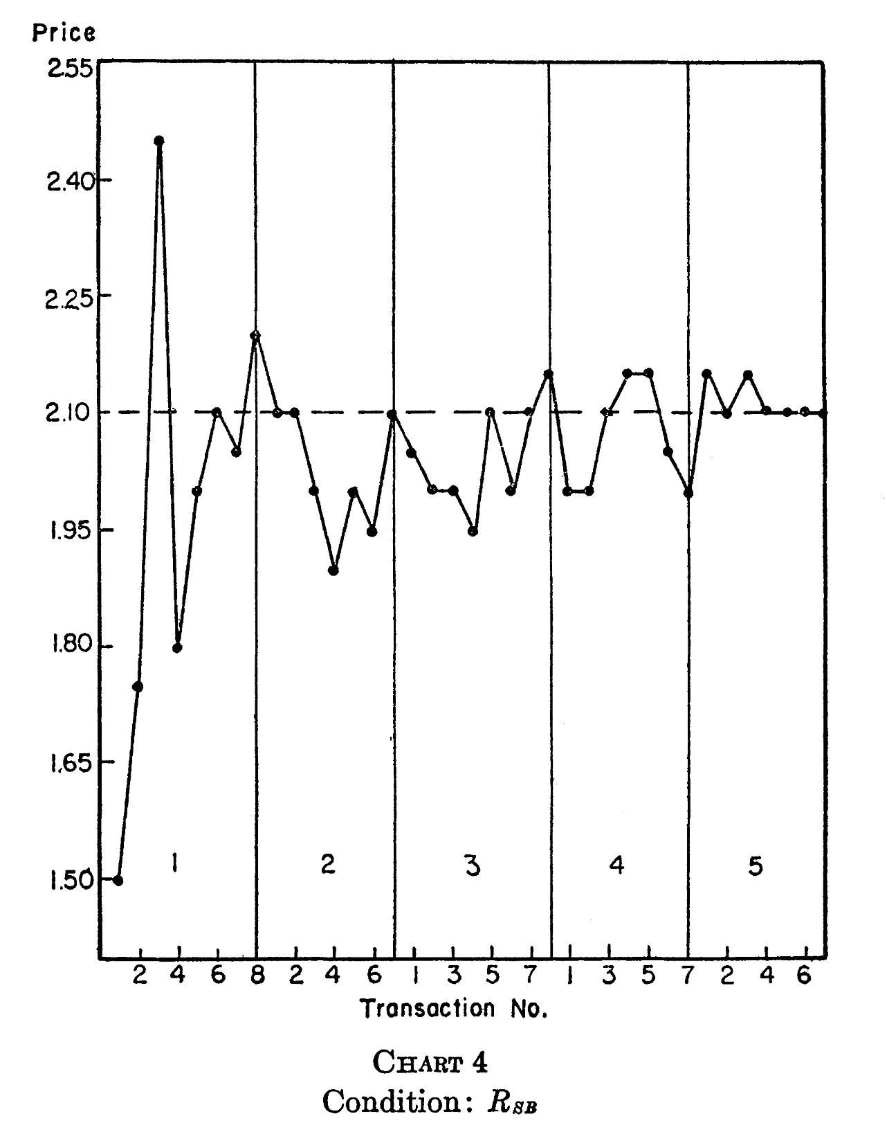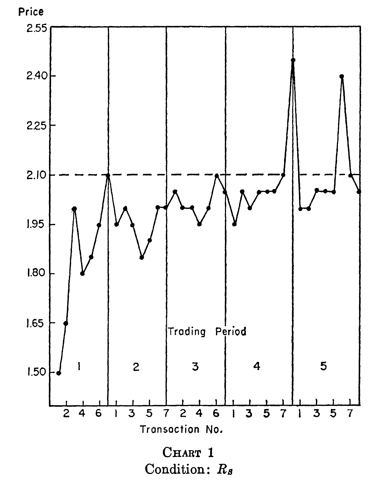 Smith found the opposite! When sellers were the only ones who could make offers, shown below, prices started below the competitive price of $2.10. Moreover, prices converged to a level below the competitive equilibrium. The mean price in the seller-only market was about 5% below the theoretical competitive price.