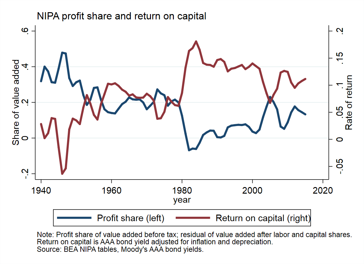 Ryan Decker ran a simpler version of Barkai’s calculation going back to 1940. If we look at the longer time series, we can see that the early 1980s was an outlier in terms of profit rates and that profit rates today are actually lower than in the 1960s and 1970s, not to mention the 1940s and 1950s. Here we can really see that the early 1980s were a trough in the profit rate.