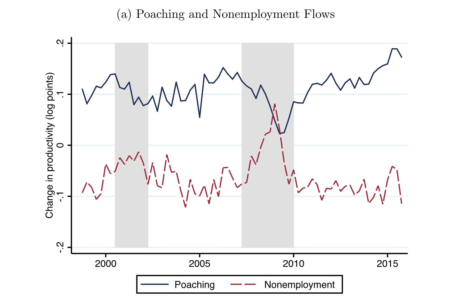 If Caballero and Hammour is the key citation for the cleansing effect, Gadi Barlevy has the paper on the sullying effect, aptly called “The Sullying Effect of Recessions.” During recessions, fewer workers quit or switch jobs voluntarily, meaning bad job matches persist longer. In boom times, a worker in an unproductive role can easily find a better job; in a bust, they hang on, and firms hesitate to replace them. This sullying effect implies the quality of worker-firm matches may decline in a recession, dragging on productivity.