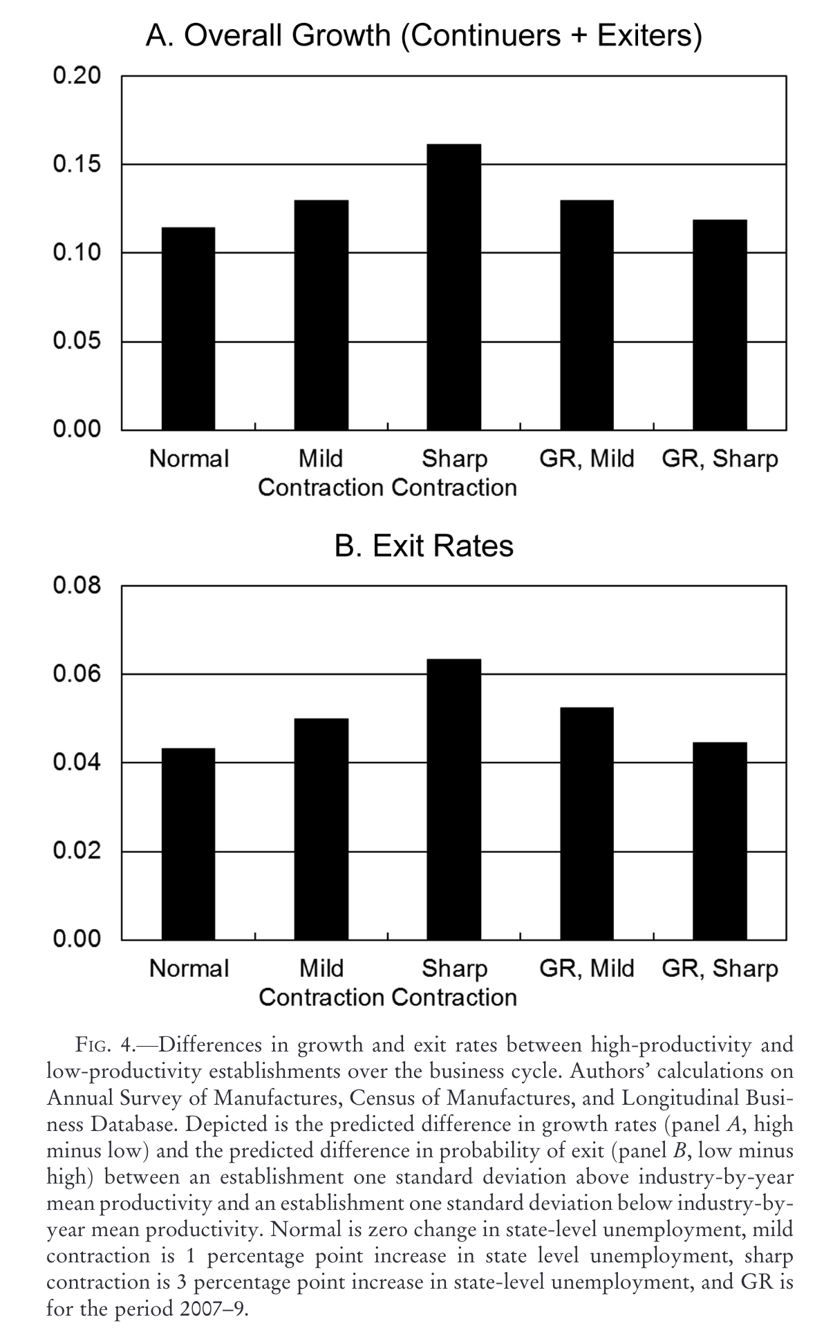 In their 2016 paper, Foster, Grim, and Haltiwanger analyze establishment-level data across multiple recessions from the 1980s through 2009. They find that in a typical pre-2007 recession, reallocation intensified and became more productivity-enhancing. When unemployment rose, the gap between high-productivity and low-productivity firms’ growth rates would widen—the efficient firms would continue expanding (or contract less) while the inefficient ones faced steeper declines. This pattern supports the cleansing hypothesis: downturns did seem to accelerate the natural selection of efficient firms over inefficient ones.