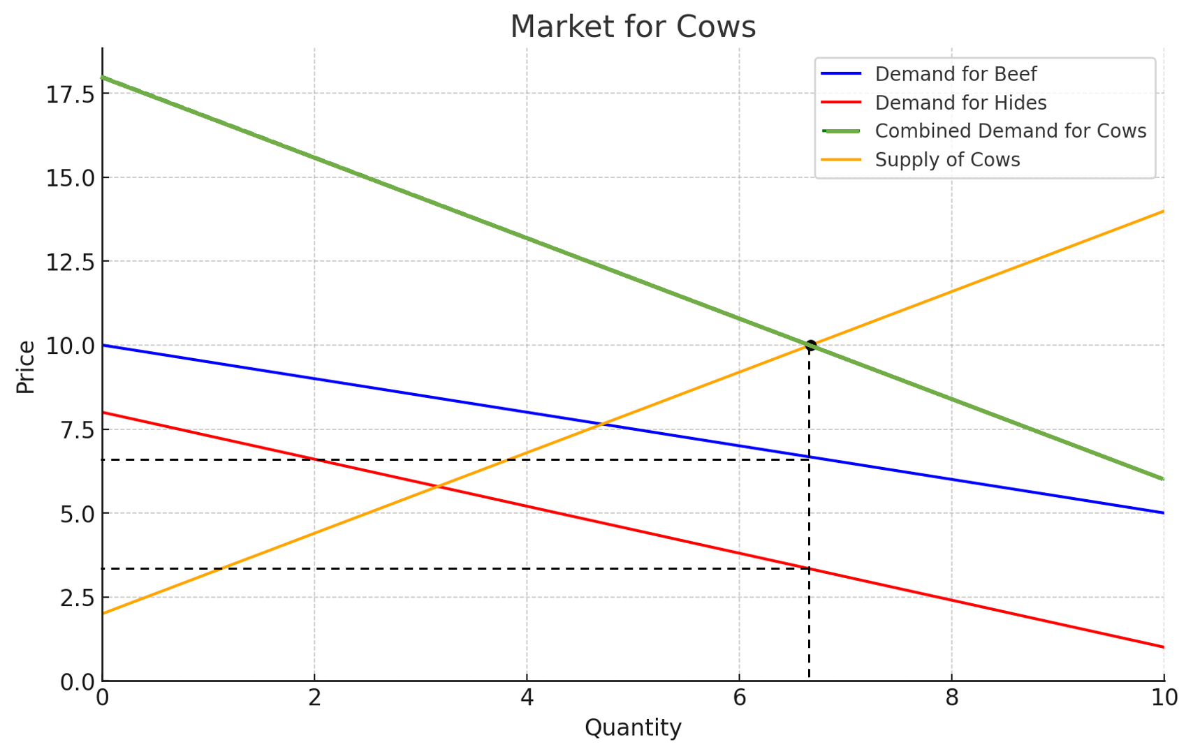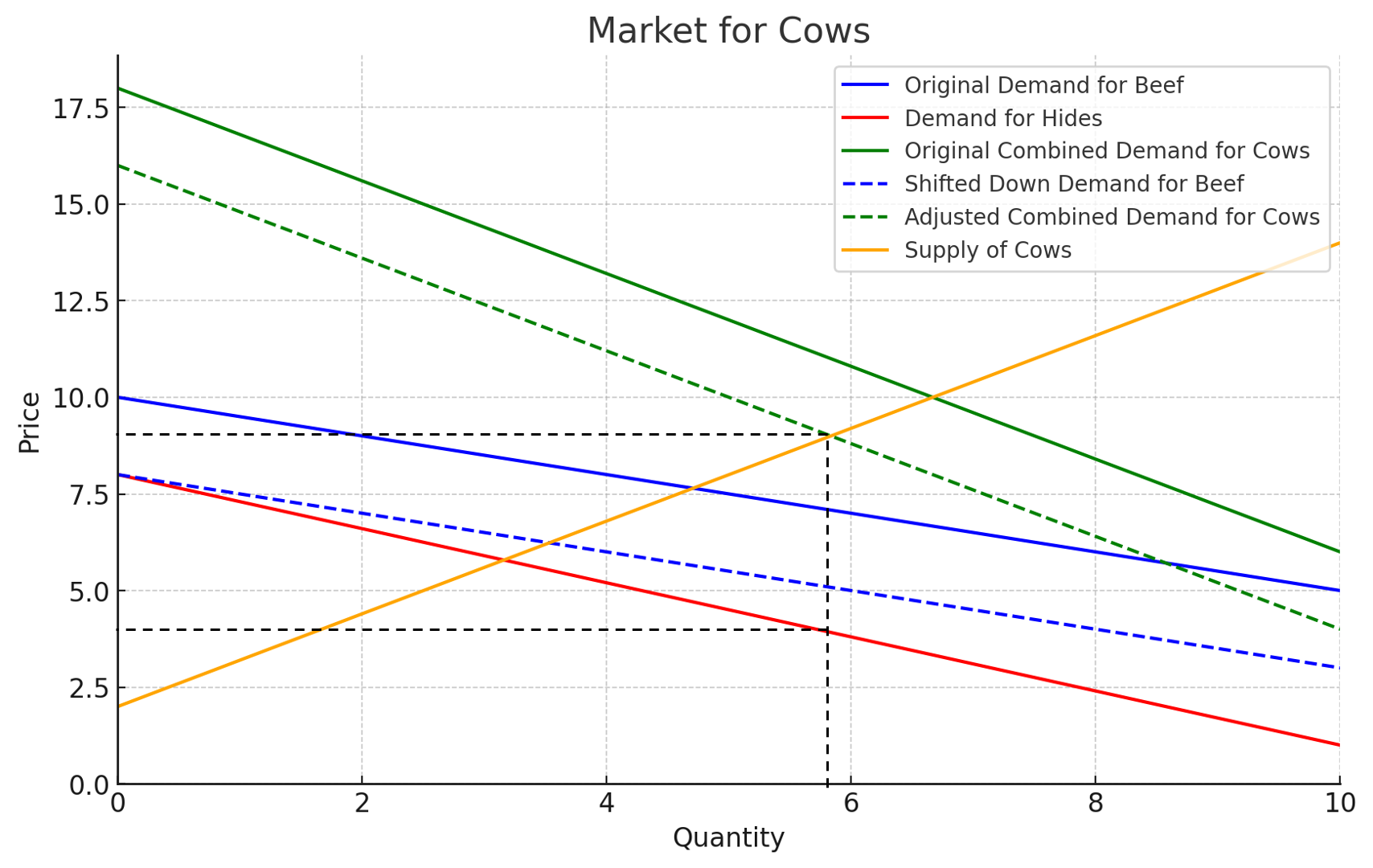 As usual, the equilibrium quantity of cows will be determined by the intersection of the supply of cows. But underneath that, there is a story about beef and hides. The black dashed lines illustrate the equilibrium quantity of cows (over 6), and the corresponding price of beef and hides.