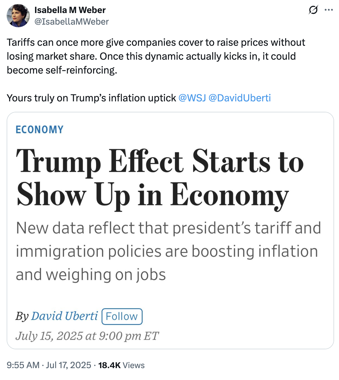 But Weber’s recent tweets offer some clarity. Weber said, “tariffs can once more give companies cover to raise prices without losing market share.” She also wrote that tariffs will “coordinate price hikes” whether or not tariffs are actually imposed.